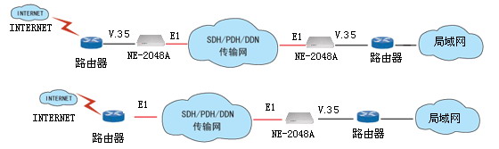 NE-2048A E1/V.35接口转换器是完成同步高速串口V.35接口到G.703接口或者G.703接口到V.35接口之间的转换,广泛用于数据通信设备中,E1口可直接与传输设备的E1口相连,V.35口可与图像、复用器、交换机、路由器的相应端口相连。