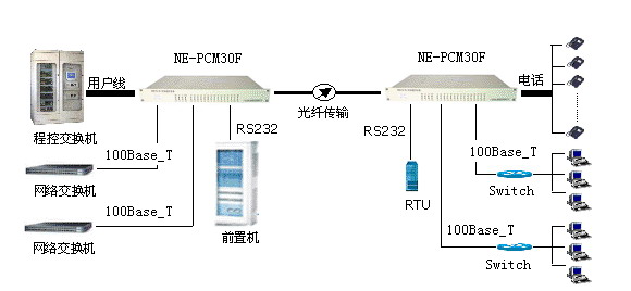 NE-PCM30F 是一中小容量的E1综合业务接入设备,将NE-PCM30 和光口集成起来,直接在光纤通道上传输的光传输接入设备,俗称电话光端机。它的传输容量仍然是一个E1。因此,最多可配置30部电话,其中,第16时隙用于电话信令的传输。在减少话路数配置的前提下,可配置最多2个10(100)BaseT以太网口,多个RS232口,每个RS232口占用E1的一个时隙,最大可传异步二进制数据达19.2Kb/S。每个以太网口,根据需要,占用一定的时隙数,但这些总的业务最大所占时隙数为30个时隙数,即最大传输带宽为1920Kb/S。