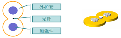 皮线光缆单芯、双芯结构应用较多,也可做成四芯结构,横截面呈8字型,加强件位于两圆中心,可采用金属或非金属结构,光纤位于8字型的几何中心。皮线光缆结构见图2: